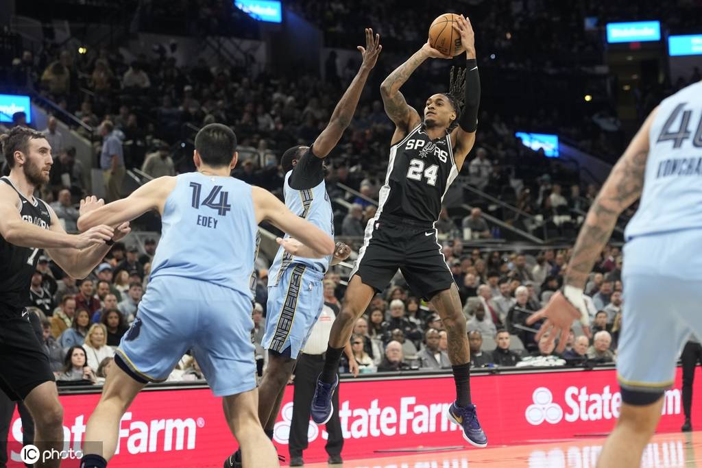 第二节,局势稍显波动,马刺依旧未能压制住灰熊的进攻,一度落后6分。随着比赛的推进,马刺在场上找到配合,逐渐恢复状态,凭借稳定的进攻将比分迅速追平,并在随后的进攻中反超至领先7分。到了节末,灰熊通过调整和坚韧的防守,再次缩小了分差。第二节结束,马刺以63-59保持领先。